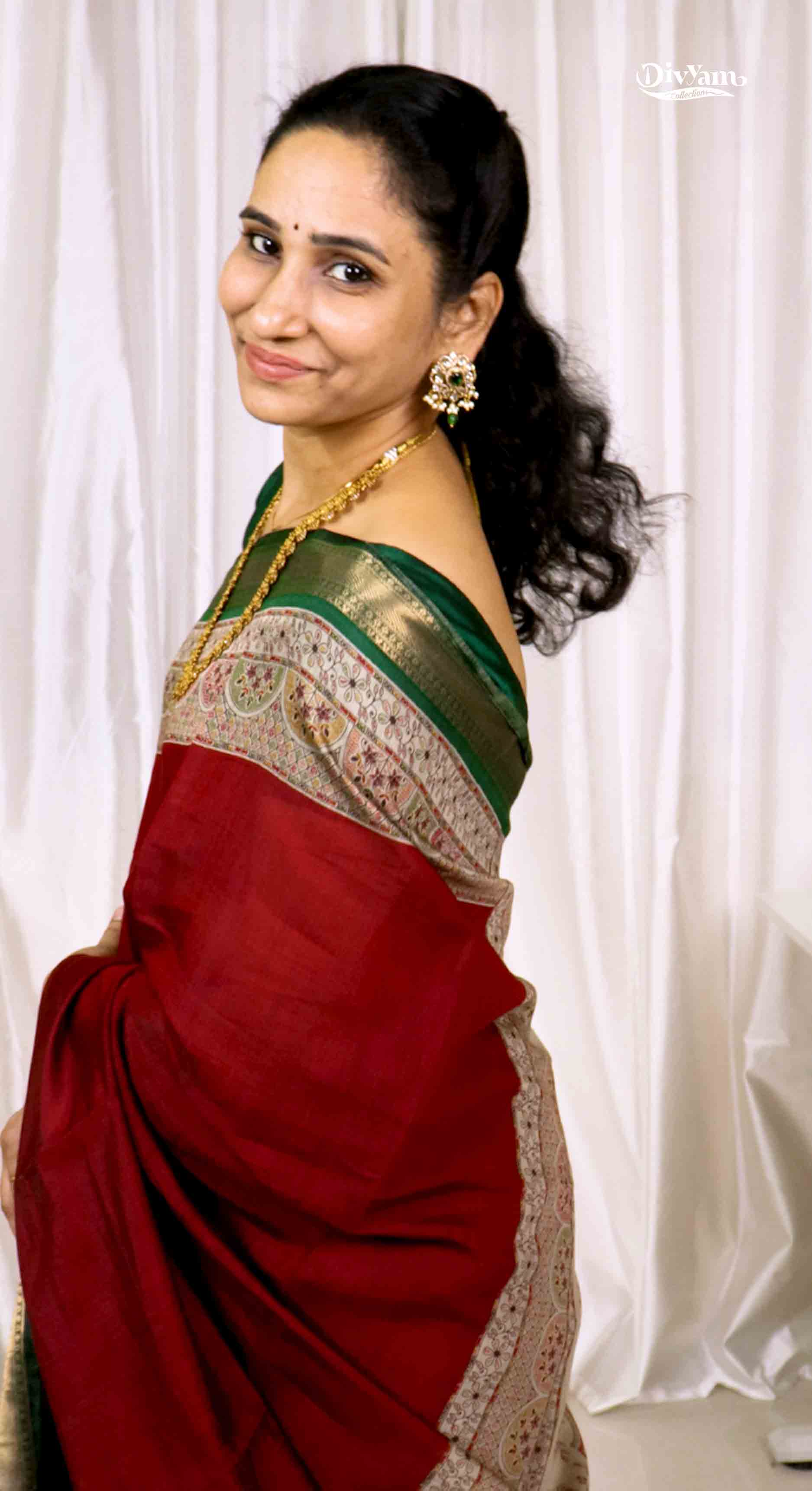 The saree features a newly designed border and pallu, giving it a refreshed traditional look while keeping the overall feel minimal and elegant. The plain body allows the border to stand out subtly, creating a look that is simple yet visually appealing.