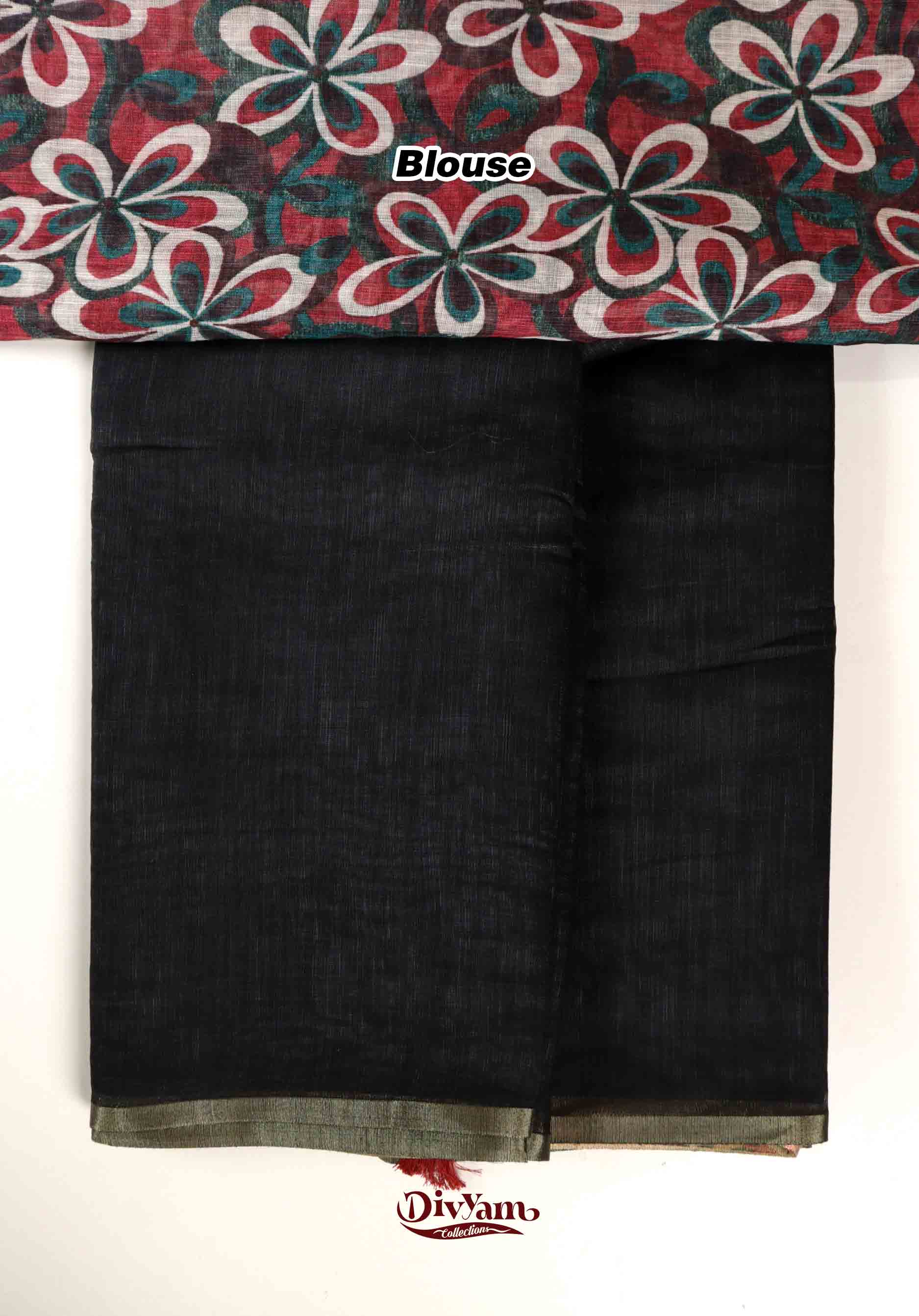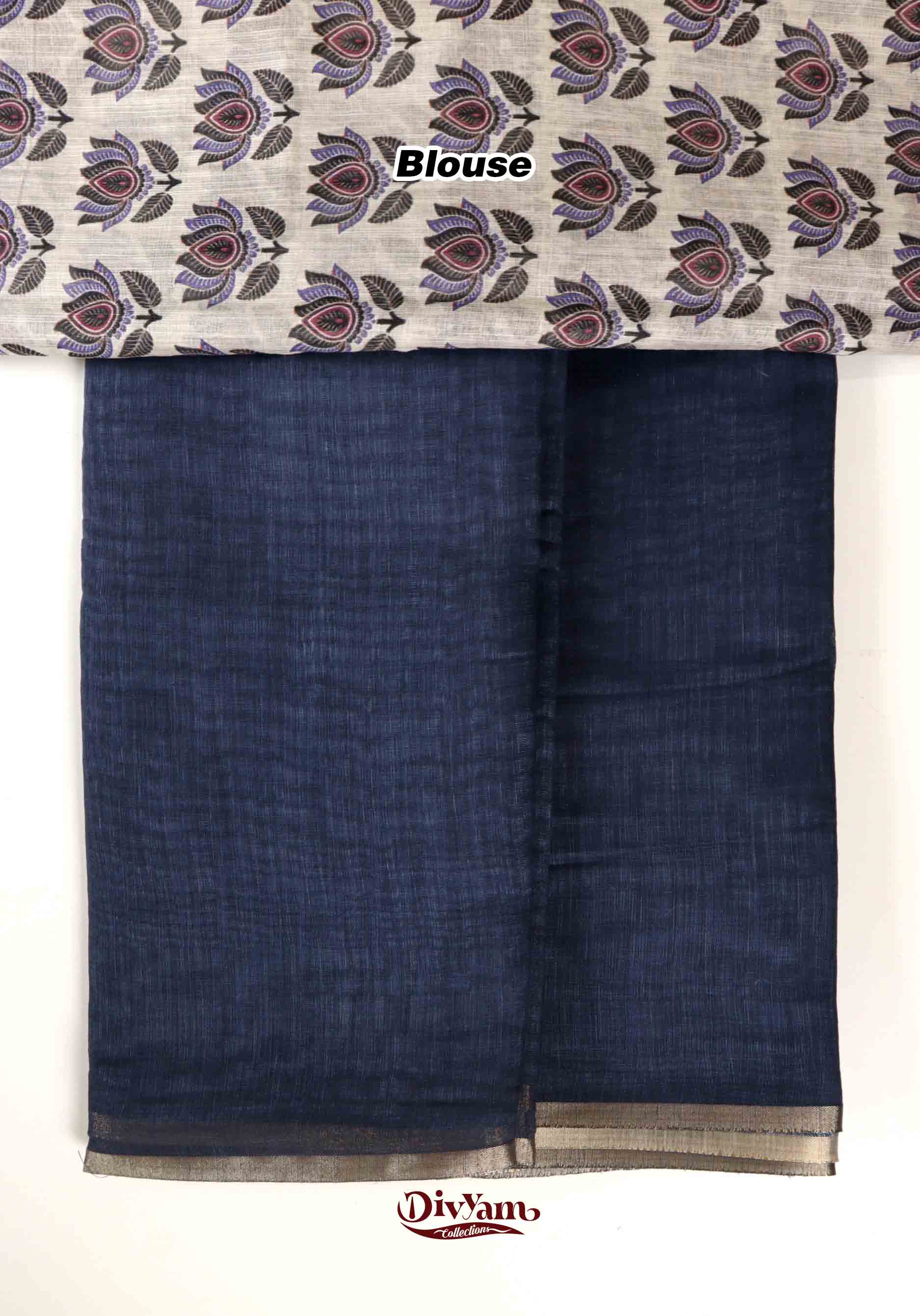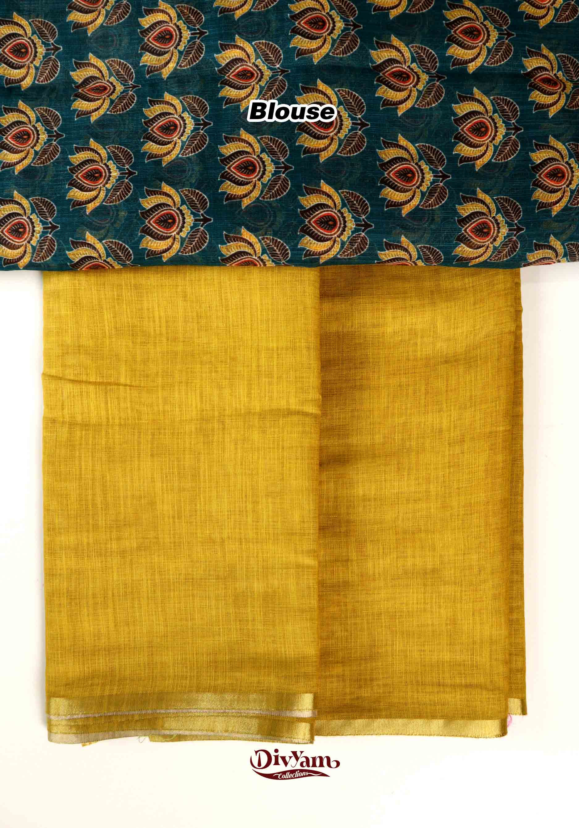 DC171 | Linen Cotton Saree with Gold Zari Stripe Border & Kalamkari Blouse | Soft Printed Collection