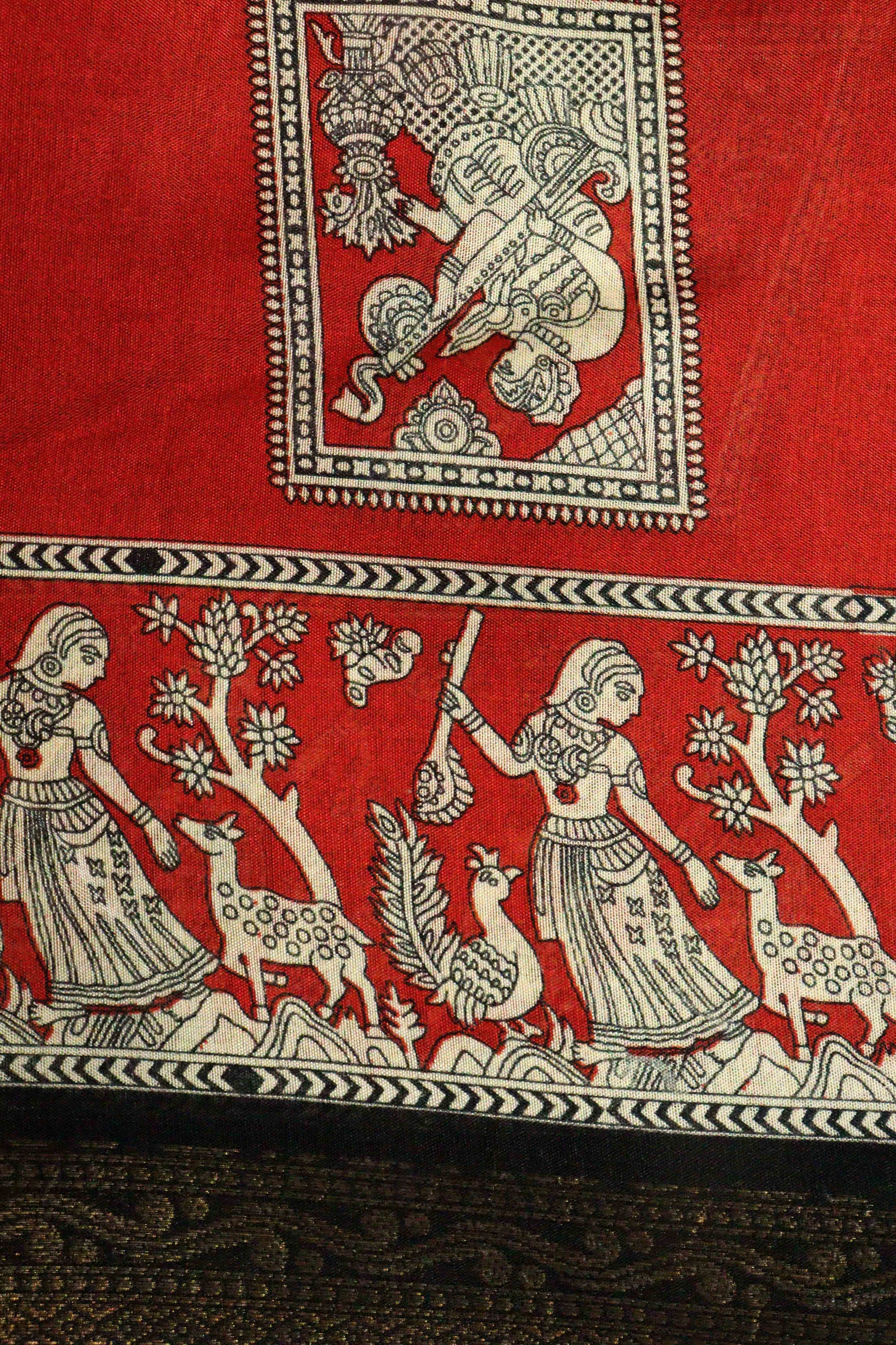 DCDS40 Red Dola Silk Saree with Kalamkari Motifs & Jacquard Border | Light Crushed Texture
