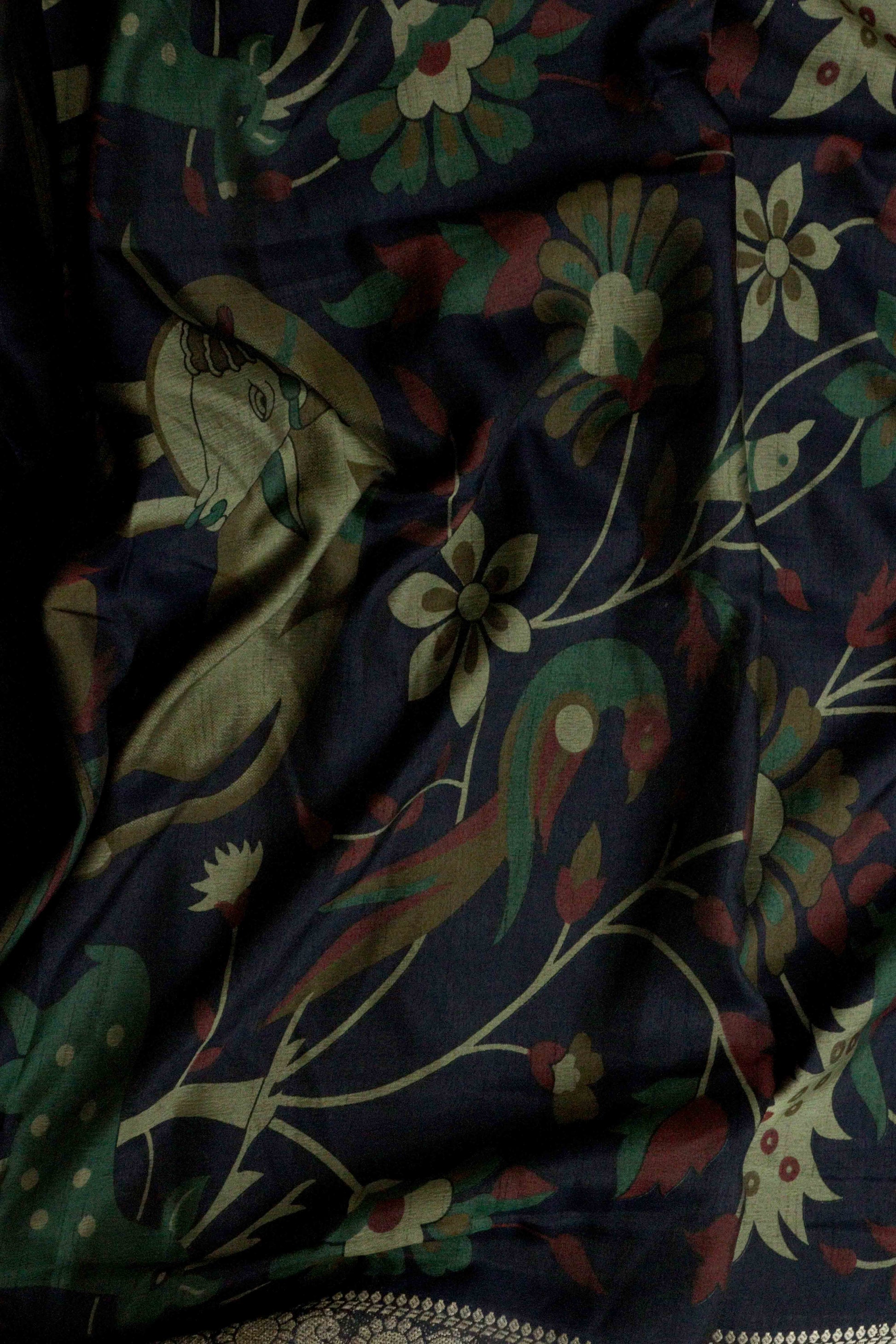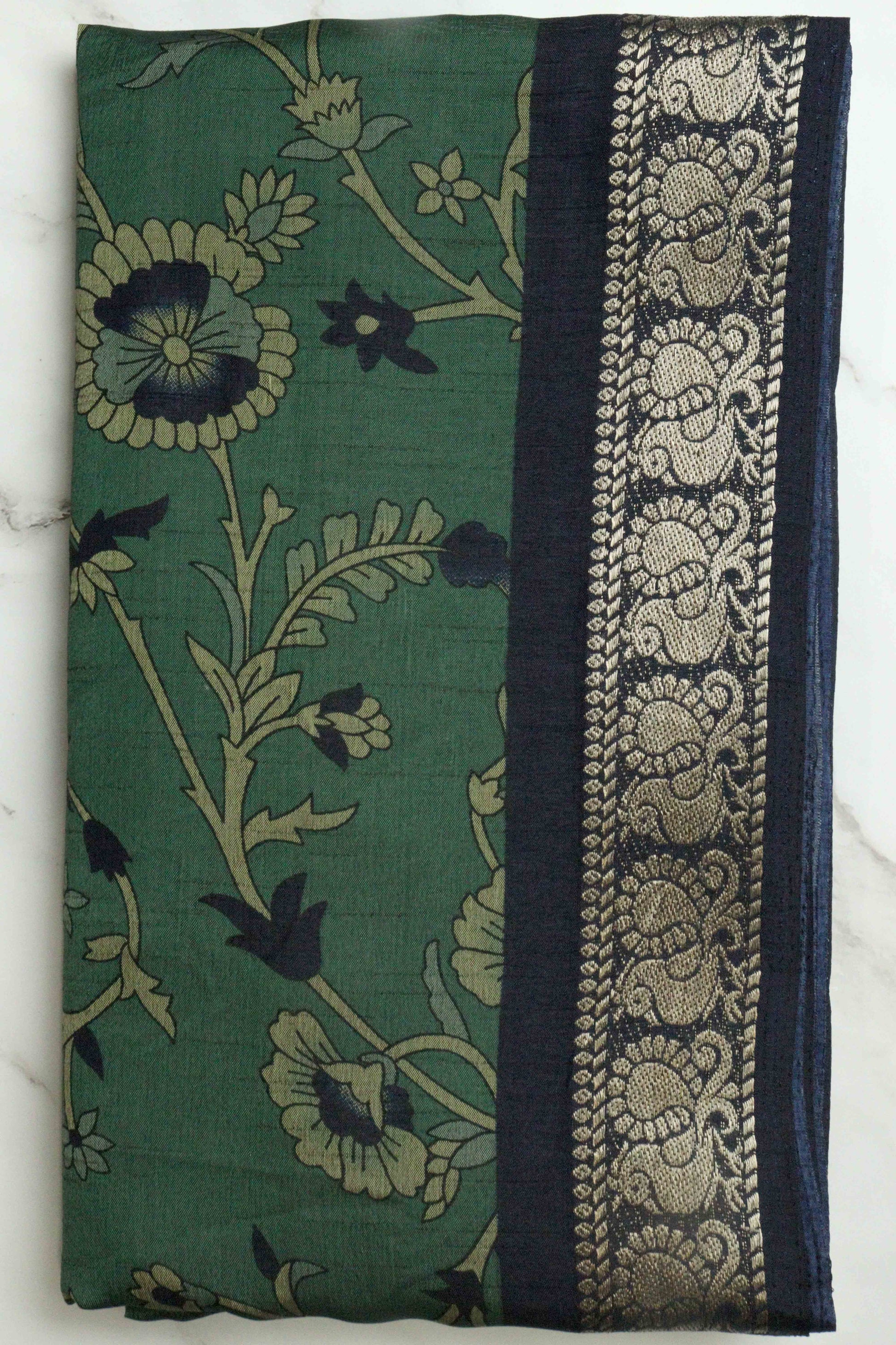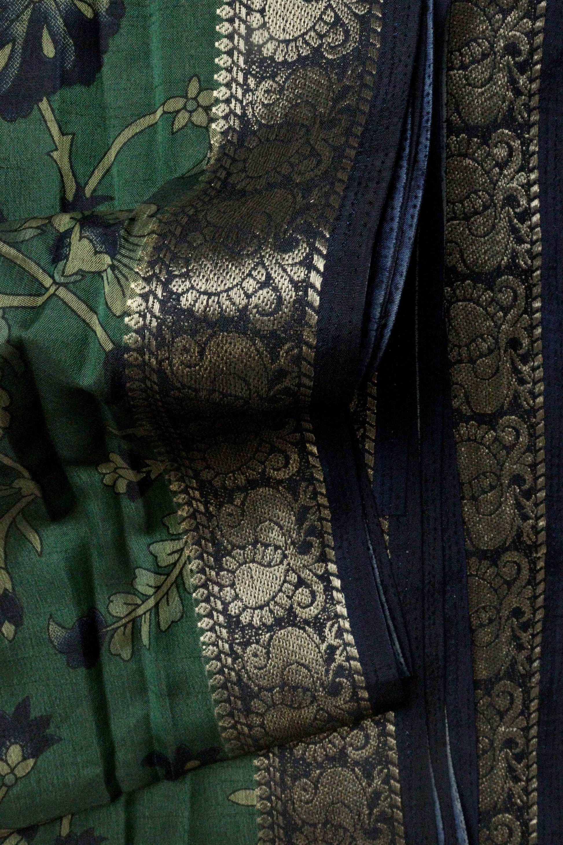 DCMS39 Bottle Green Maheshwari Silk Sarees with Narayanapattu Border & Kalamkari Print