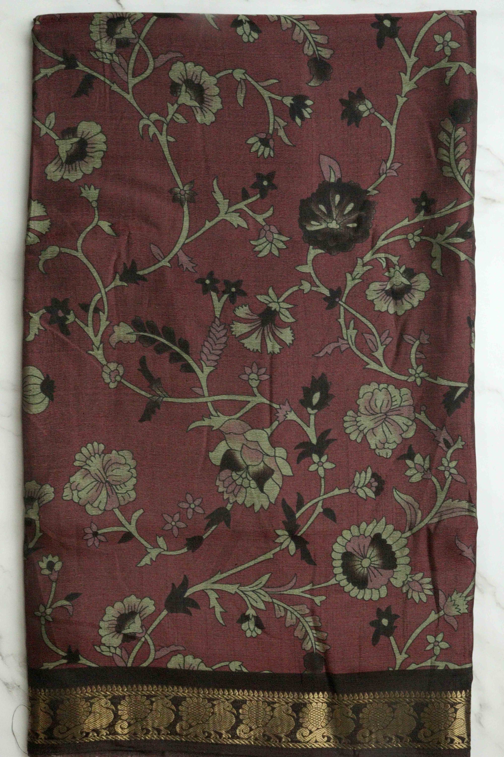 DCMS39 Maroon Wine Maheshwari Silk Sarees with Narayanapattu Border & Kalamkari Print