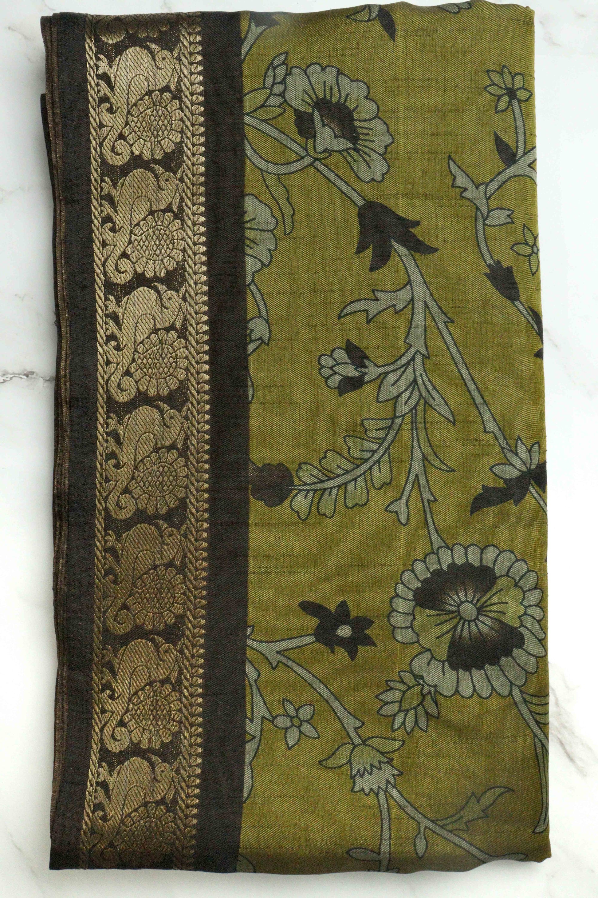 DCMS39 Mustard Green Maheshwari Silk Sarees with Narayanapattu Border & Kalamkari Print