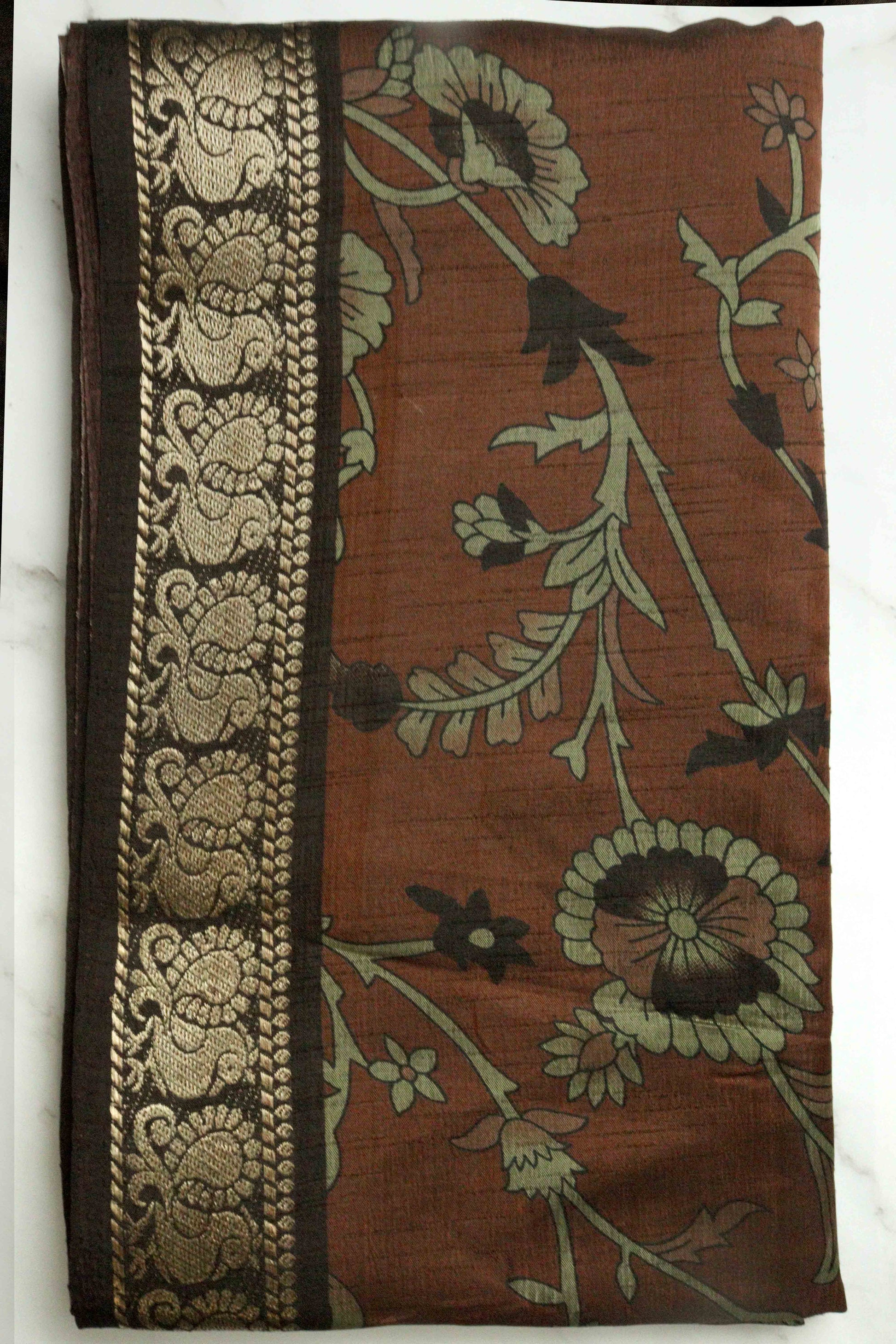 DCMS39 Rust Brown Maheshwari Silk Sarees with Narayanapattu Border & Kalamkari Print